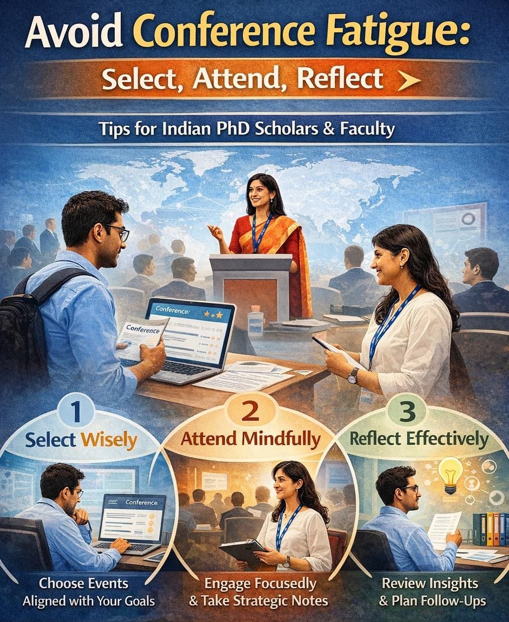 Conference fatigue is avoidable when scholars adopt a strategic approach: select the right events, attend mindfully, and reflect afterward. For Indian PhD students and faculty, this approach ensures meaningful engagement, sustained learning, and productive networking. Conferences are powerful tools for research visibility and professional development, but their value depends on thoughtful participation. By balancing energy, focus, and reflection, scholars can make each conference a rewarding and impactful experience, supporting both career growth and academic excellence.