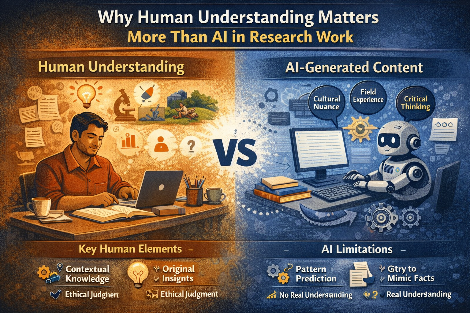 But beneath the convenience lies a deeper question: What makes research meaningful? The answer is not just good language or structured writing. It’s understanding. True research requires critical thinking, contextual awareness, and the ability to interpret complexity — qualities that no AI, however advanced, can replicate. For Indian scholars navigating a diverse, layered academic system, human understanding remains at the heart of meaningful research.